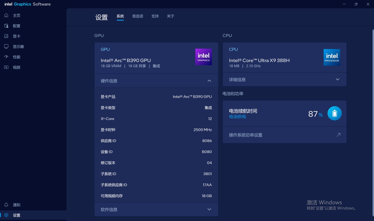 本代起,Intel处理器中的核显命名方式与独显产品线一致,Ultra X9 388H中的核显型号为Arc B390,为本代核显的旗舰规格,拥有12个Xe核心,最大频率2.5GHz。