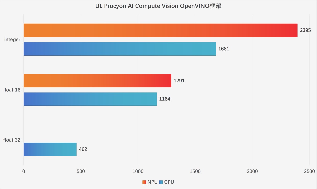 我们使用UL Procyon中的AI Benchmark进行测试,选择GPU与NPU负载在Windows ML、OpenVINO框架下测试,得分情况如下: