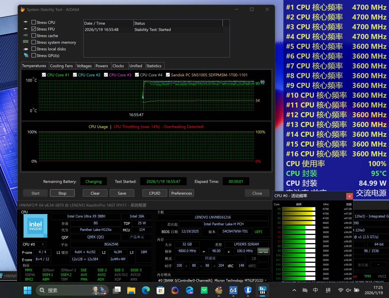 打开极客模式,AIDA 64 Stress FPU 30分钟烤机,功耗稳定在85W左右,P核心频率4.7GHz、E核心频率与LPE核心频率均为3.6GHz,温度95度。小新Pro 16GT作为当前性能级的轻薄本,其性能释放依旧是它的核心卖点之一。