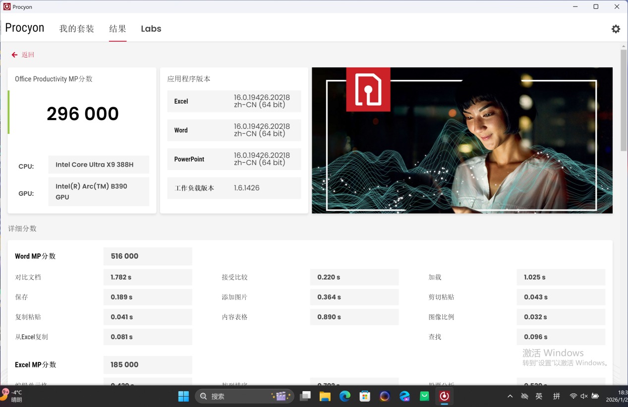 UL Procyon Office Productivity BenchMark会调用Office办公三件套Word、Excel、PowerPoint,我测试的是跨平台版本所以不会调用Outlook进行测试,最终的得分为296000,对于Panther Lake来讲普通的Office办公是小菜一碟了。