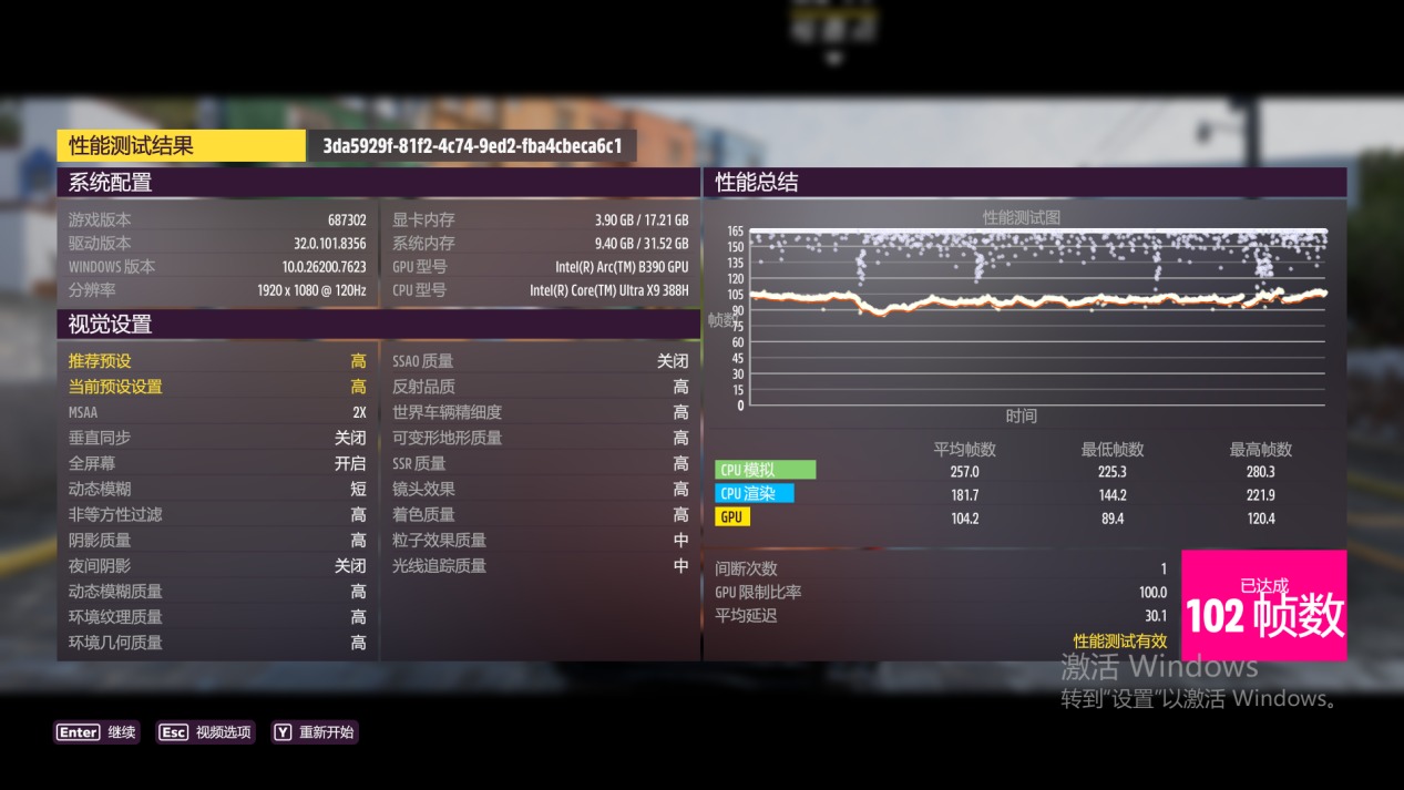 再看看其他游戏的表现,赛车竞速游戏《地平线5》,高画质,运行游戏内的BenchMark,平均帧数为102帧。