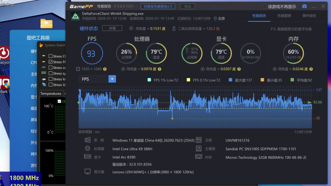 近期爆火的《三角洲行动》在1080P中等画质大坝跑刀1小时也有93帧的平均帧数。