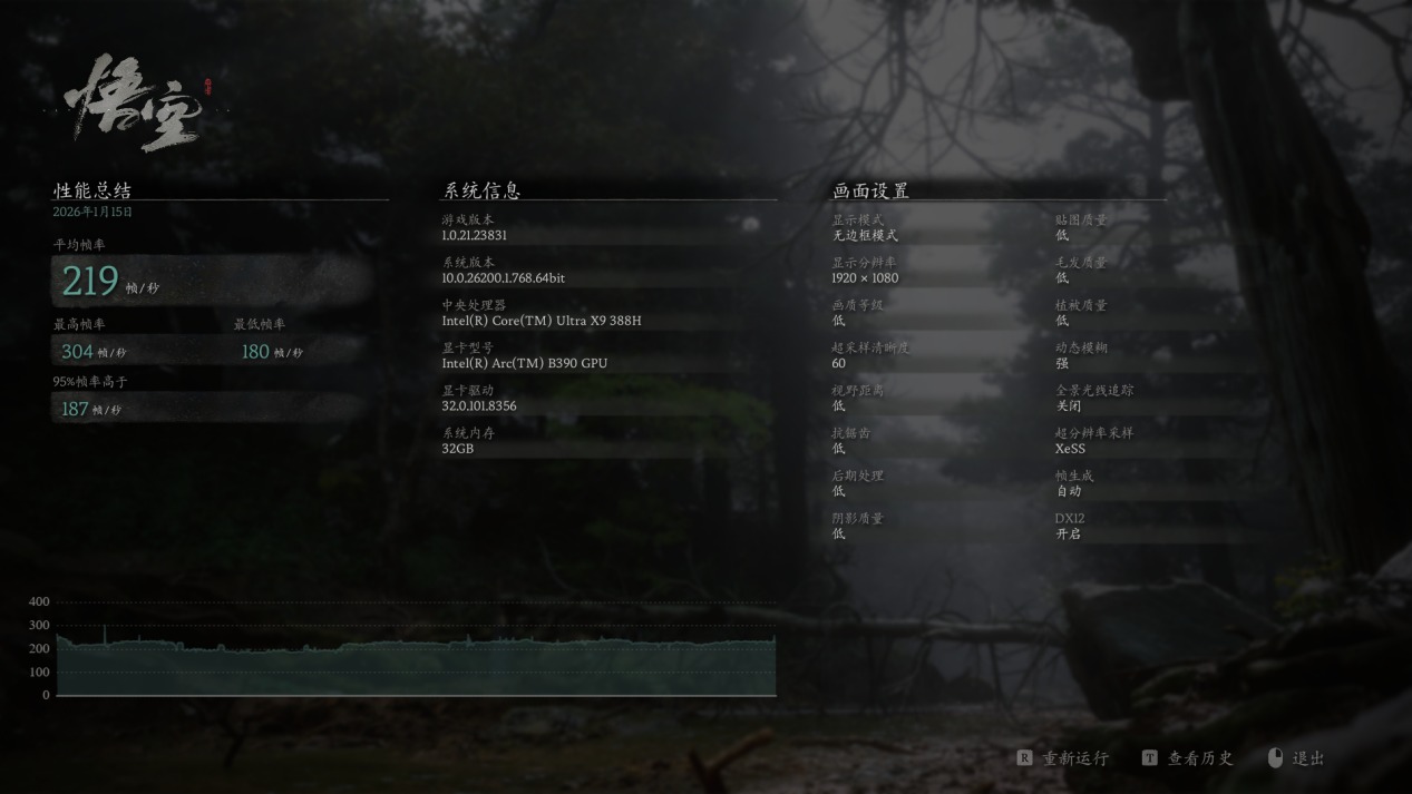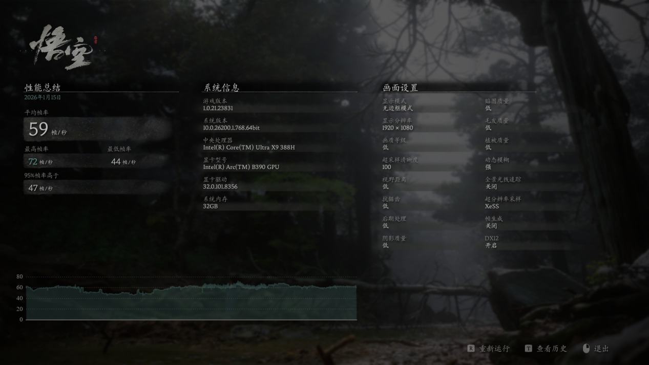 首先我们来看下原生分辨率下的游戏帧数情况,在两款3A大作《黑神话:悟空》与《赛博朋克2077》中,全低画质下运行游戏内的BenchMark,平均帧数分别为59帧与85帧,不依靠超分功能Arc B390就已经足以真正流畅的运行3A大作了。
