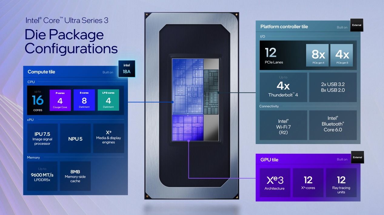 P核心采用Cougar Cove微架构打造、E核心与LPE核心采用Darkmont微架构打造,在Intel 18A工艺加持下,能效比/IPC提升。其中P核心与E核心为性能集群,LPE核心单独构成能效集群。4个P核心每个核心都拥有独立L2缓存,8个E核心分为两簇,每簇共享L2缓存;四个LPE核心拥有共享的L2缓存和内存连接能力,但未配备L3缓存。除此之外,Compute Tile中加入了8MB的内存侧缓存设计,可通过减少对主内存的访问次数进而减少访问延迟与改善功耗表现。