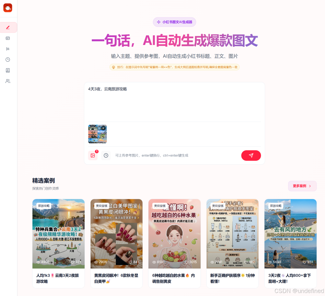 •第一步:输入主题或参考图 你只需要输入一个简单的想法,比如“昆明大理 5 天旅游攻略”,或者直接上传一张你觉得不错的参考图,它就能精准抓取风格。