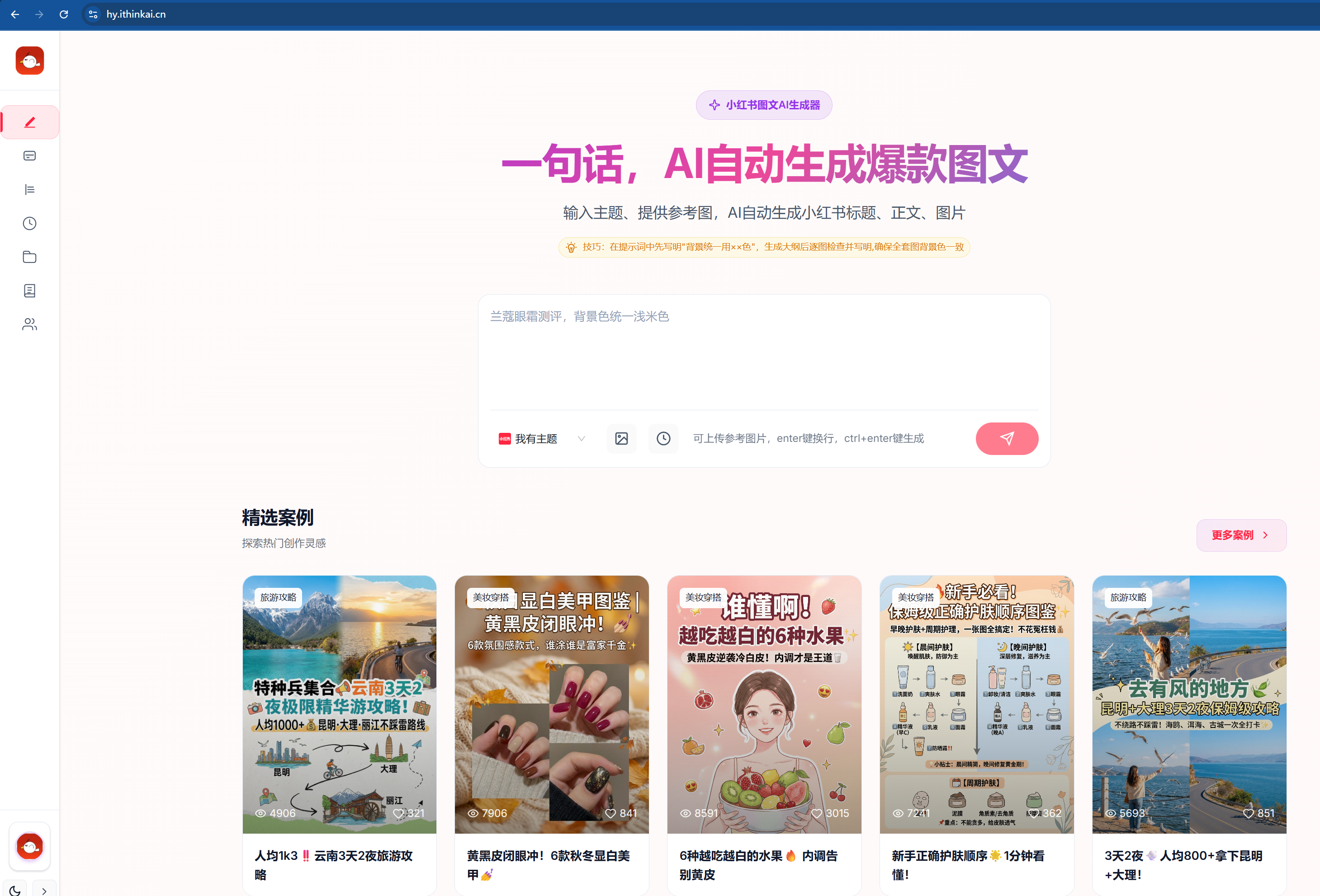 它的核心逻辑非常老练:不仅是生成图片,而是帮你把标题、正文、配图整套逻辑闭环。它特别适合那些需要批量做图文的自媒体人,能实现 1 分钟 1 篇高质量笔记。
