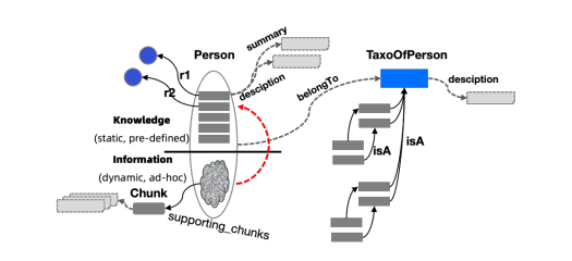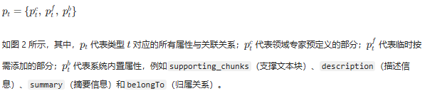 supporting_chunks代表包含该实例 ei 的所有文本块集合,用户可在 KAG 构建阶段定义文本块的生成策略及最大长度;description代表针对类型 tk 的通用描述信息。值得注意的是,附加在类型 tk 上的description与附加在实例 ei 上的description含义不同:当description绑定到 tk 时,它表示该类型的全局描述;反之,当它与实例 ei 关联时,它表示与原始文本文档上下文一致的、针对 ei 的通用描述信息。description能够有效辅助大语言模型理解特定实例或类型的精确含义,可应用于信息抽取、实体链接、摘要生成等任务;summary代表实例 ei 或关系 rj 在原始文档上下文中的摘要内容;belongTo代表从实例到概念的归纳语义关系。每种实体类型(EntityType)或事件类型(EventType)都可通过belongTo关联到一种概念类型(ConceptType)。
