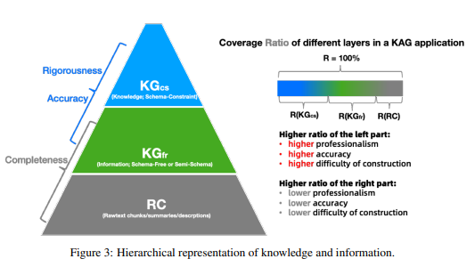 为更精准地定义信息与知识的层级化表示,如图 3 所示,我们将KGcs记为知识层,指代遵循领域模式约束、经过归纳、整合与校验的领域知识;将KGfr记为图信息层,指代通过信息抽取得到的实体、关系等图结构数据;将RC记为原始文本块层,指代经过语义切分后的原始文档块。