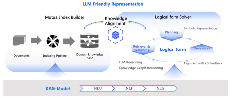 构建面向 KAG 的专用模型。为支撑 KAG 框架运行所需的索引构建、检索、问题理解、语义推理、文本摘要等能力,对通用大语言模型的自然语言理解(NLU)、自然语言推理(NLI)、自然语言生成(NLG)三项核心能力进行强化,使模型在各功能模块中实现更优表现。