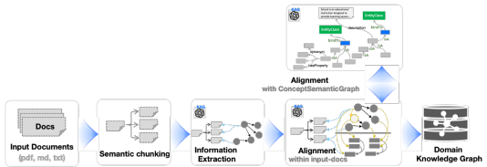 图 4:面向领域非结构化文档的 KAG 构建器流水线。从左至右,首先通过信息抽取得到短语与三元组,随后通过语义对齐完成消歧与融合,最终将构建好的知识图谱写入存储。