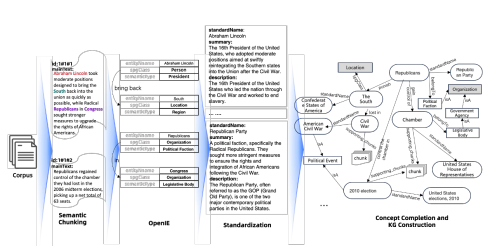 针对给定数据集,我们采用无需微调的大语言模型(如 GPT-3.5、DeepSeek、通义千问等)或自研的微调模型 Hum,抽取实体、事件、概念及关系,以构建图信息层(KGfr),并进一步建立 KGfr 与 RC 之间的双向索引结构,实现基于实体和关系的跨文档关联。