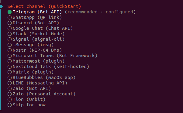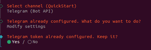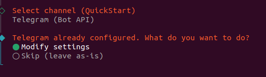 这里我选择telegram ,因为之前配置过,所以显示configured