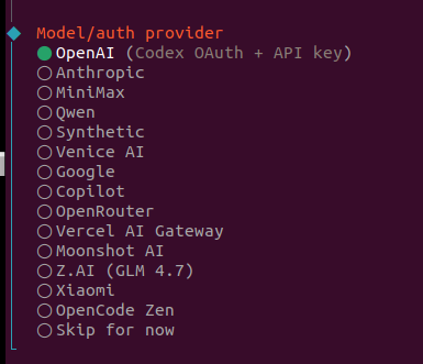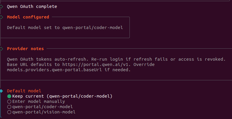 继续选择千问的具体模型,这里我选择Keep current (qwen-portal/coder-model):