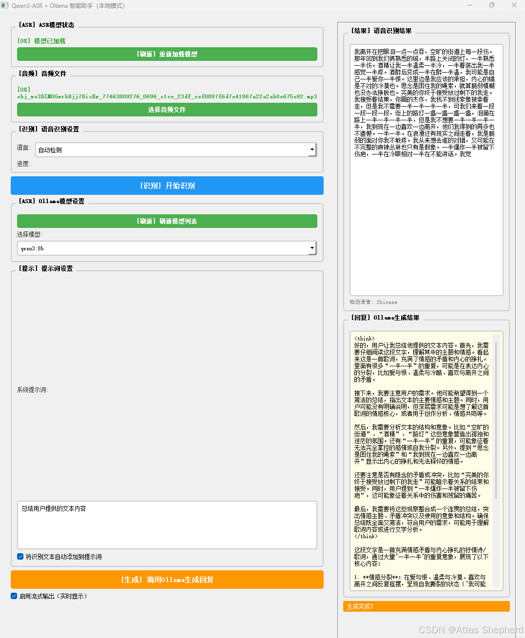 基于PyQt5的桌面应用程序,结合了Qwen3-ASR语音识别和Ollama本地大语言模型的智能助手工具。