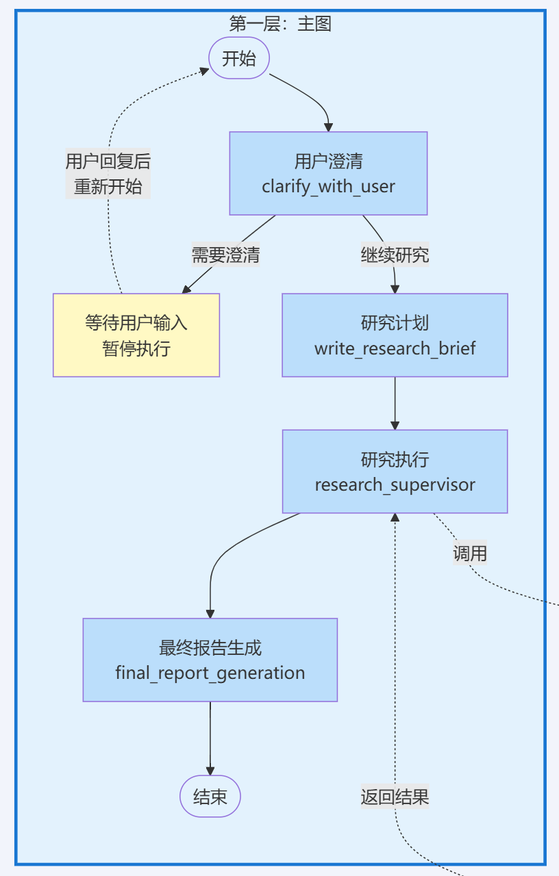 - • 主图层:线性管道结构,负责"澄清→规划→研究→报告"的整体流程编排