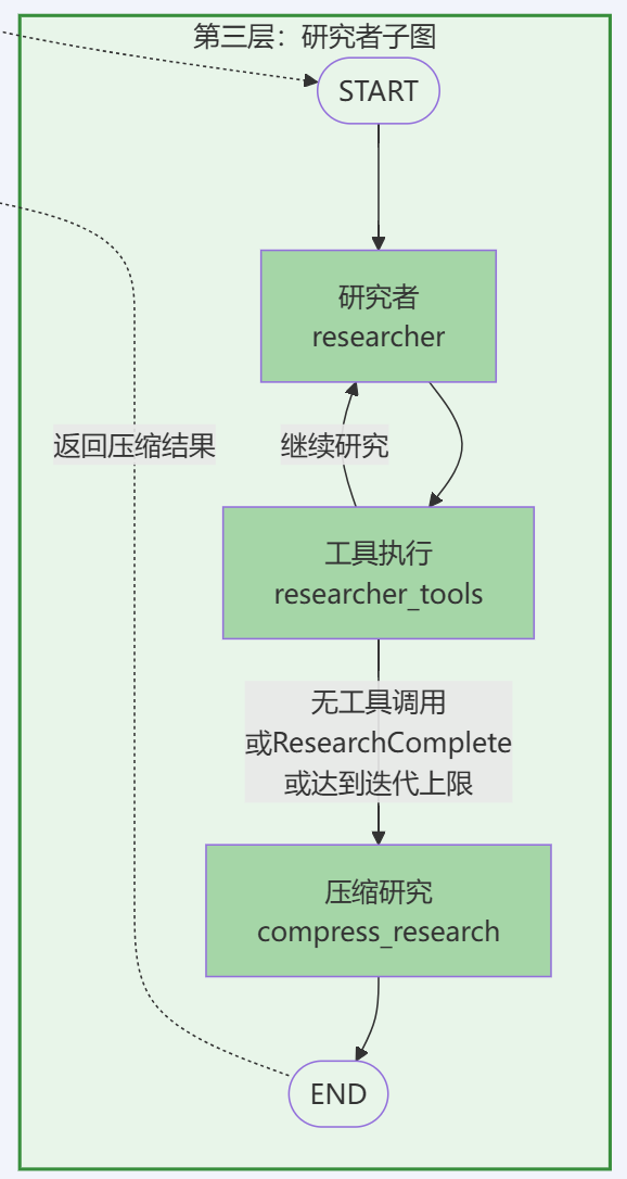 ConductResearch工具并行调用多个研究者子图 - • 研究者子图层:带条件分支的循环结构,负责具体的研究执行和结果压缩