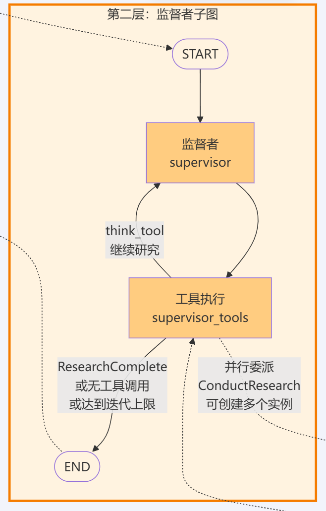 工具执行结束的,执行结果将被封装为ToolMessage并返回给 supervisor节点,supervisor节点会分析研究结果,决定是否需要进一步研究,如果是的,则又会生成工具调用响应转发给supervisor_tools节点,从而实现迭代式的研究循环,直到满足退出条件。