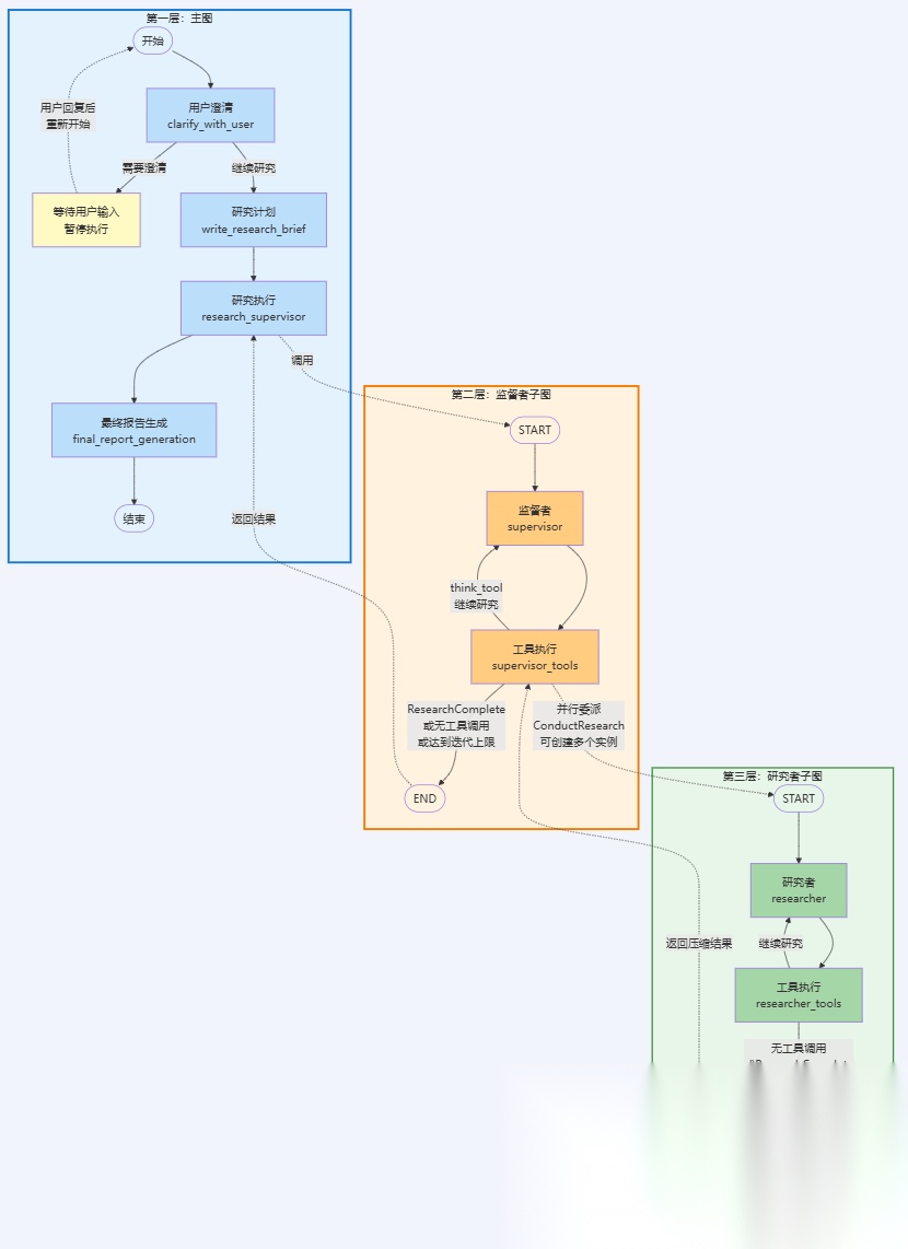 deep\_researcher):负责整个研究流程的协调与管理。主图包含四个核心阶段:用户澄清(clarify_with_user)用于确认研究需求、研究计划(write_research_brief)用于将用户输入转换为详细的研究简报、研究执行(research_supervisor)通过调用监督者子图来执行实际研究、最终报告生成(final_report_generation)用于综合所有研究结果生成最终报告。 - • 第二层:监督者子图(
