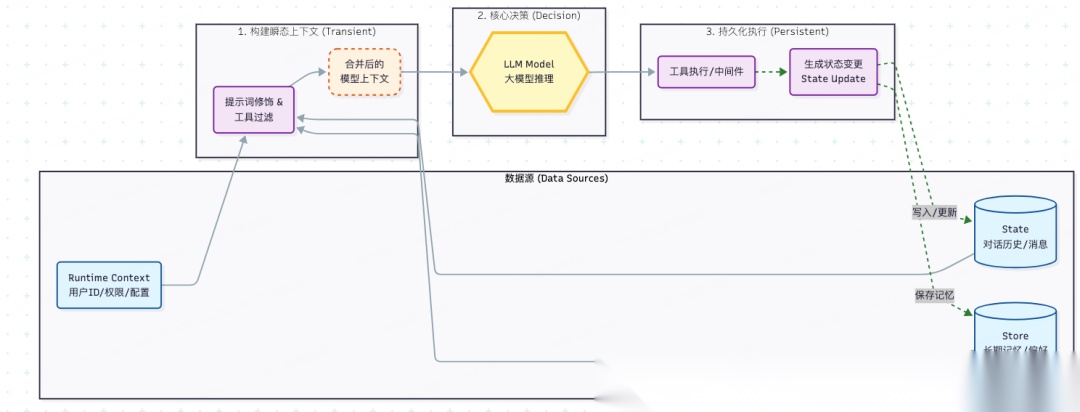 - 瞬态上下文(Transient Context):仅影响当前单次模型调用的视角,不改变系统状态。主要是**模型上下文(01)。**例如:动态注入 System Prompt 或过滤敏感工具。
