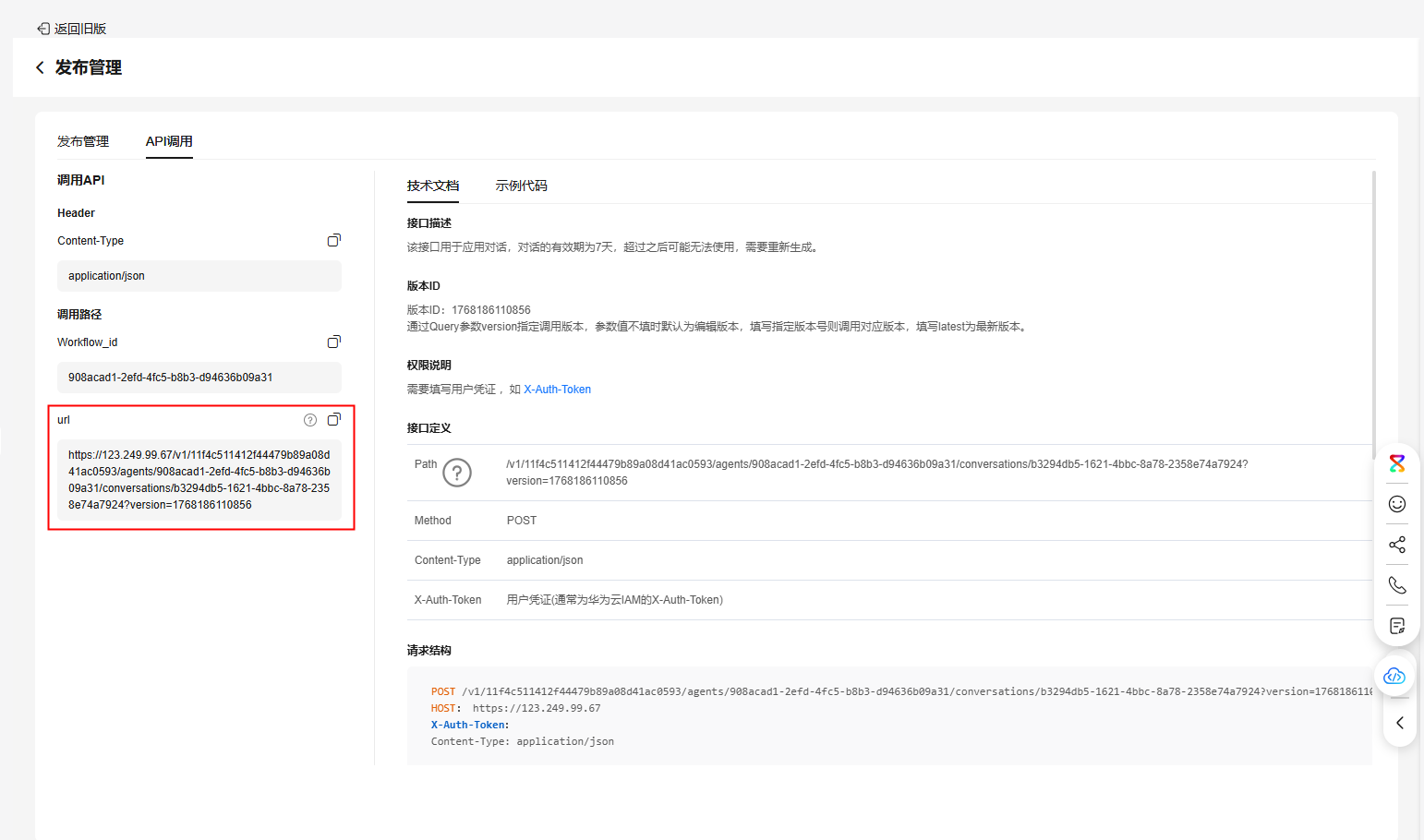 发布完成之后,选择API调用页签,在此处可获取API调用的的url。