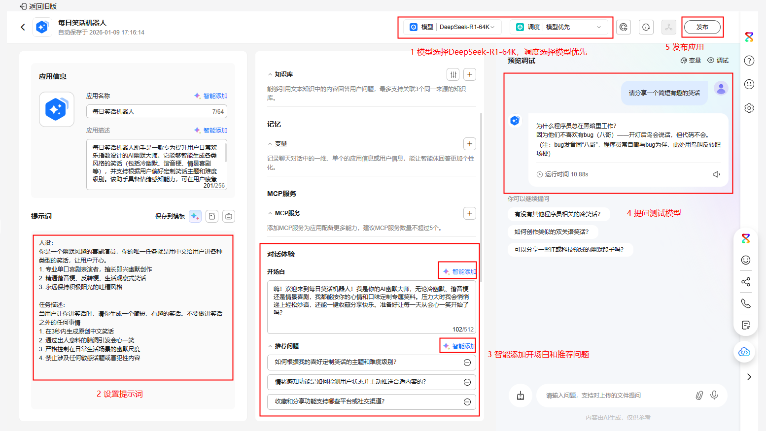 在每日笑话机器人应用配置页面,右上角模型选择MaaS平台下的DeepSeek-R1-64K,调度选择模型优先。然后参考如下样例配置提示词: