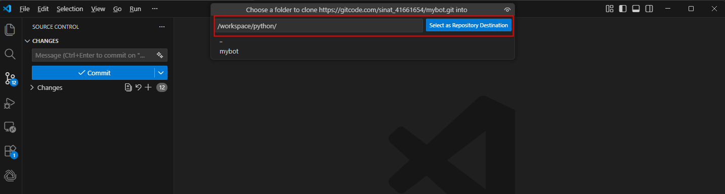 选择代码仓目录:/workspace/python/,点Select as Repository Destination。