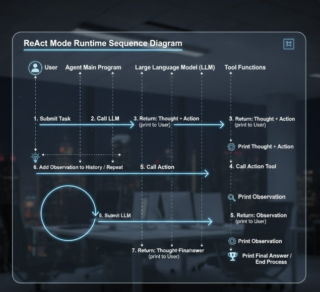 为了更直观地理解ReAct模式的运行过程,我们来看看这张时序图,它展示了用户、Agent主程序、大模型和工具函数之间的互动: