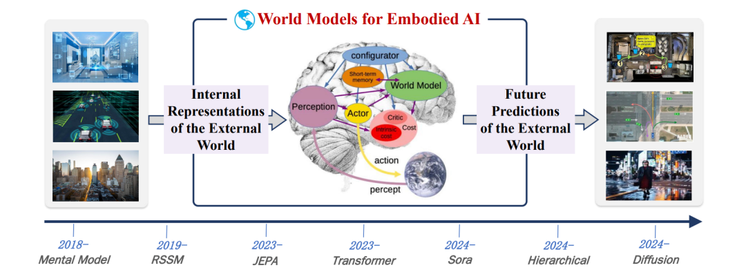 世界模型WMs(如 Mental Model、RSSM、JEPA、Dreamer-v3、Sora 和 Genie)使智能体能够建模和预测环境动态,支持基于想象的规划以及在动态且不确定环境中的前瞻性决策。