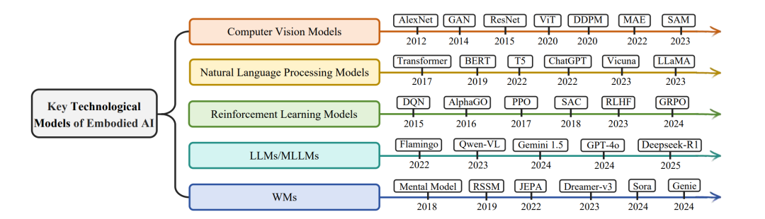 具身智能的快速发展与基础技术模型的进步密切相关,例如CV、NLP、RL、LLMs/MLLMs以及WMs(如图 3所示),这些模型能够显著提升智能体在感知、认知和交互方面的能力。