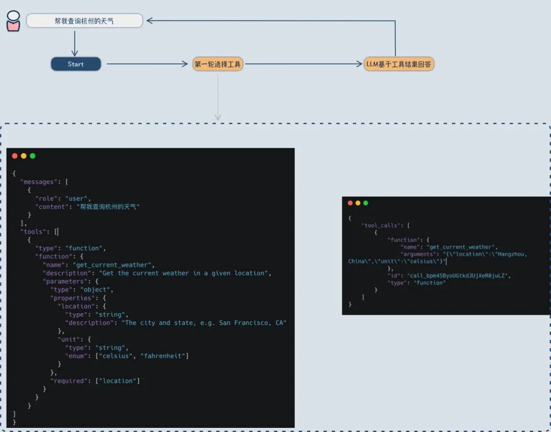 第一次、将用户的查询和工具信息一起提供给模型,模型会根据这些信息推理出需要执行相应的工具及其参数。