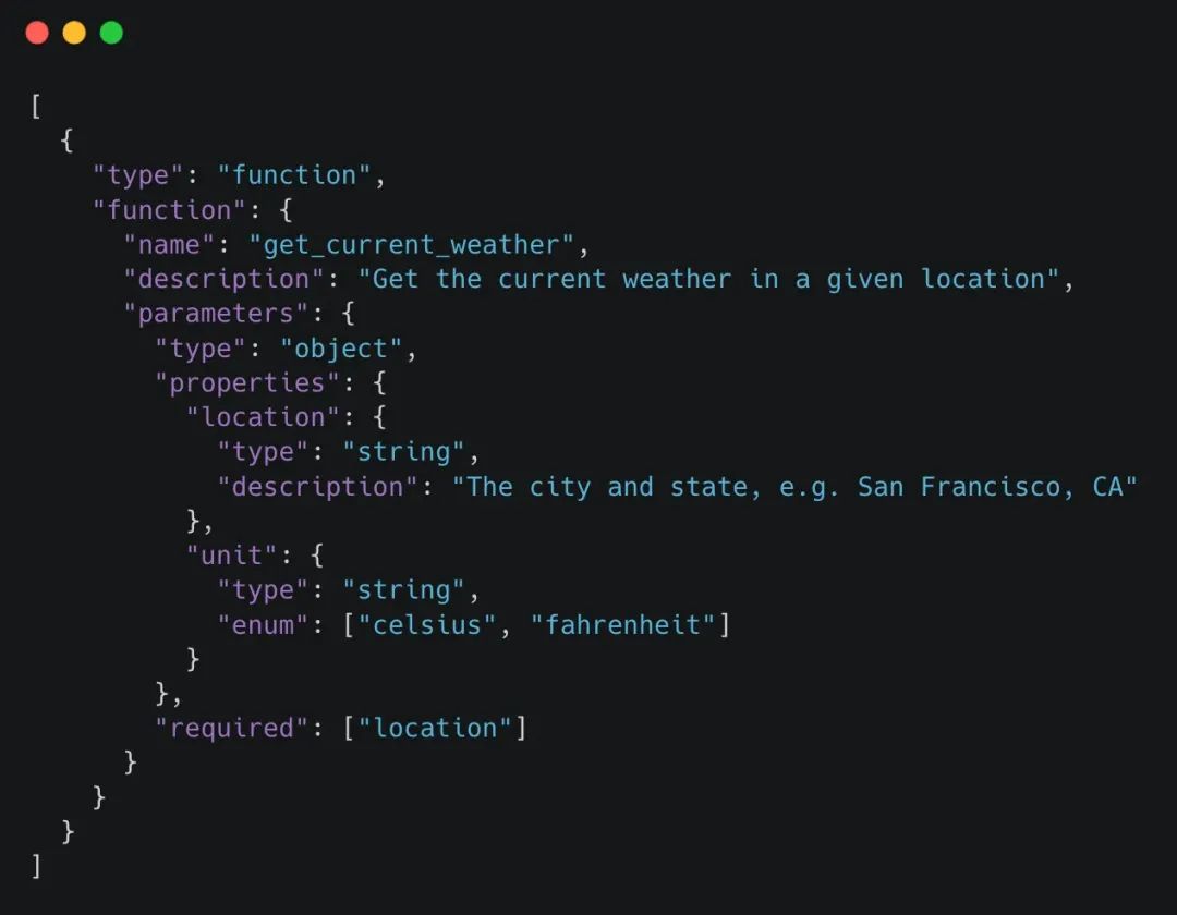 “Tools”是一个工具集合的数组,其中包含了工具的作用描述和所需参数,例如天气查询工具的定义如图示。