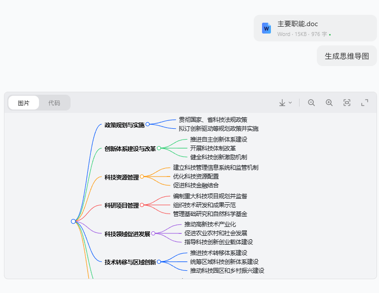 通过输入不同要求对文字材料、数据材料进行可视化处理(思维导图、折线图、饼状图等),这里以文字材料转化思维导图为例。