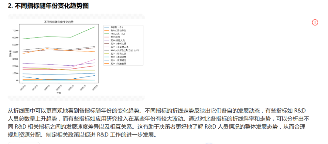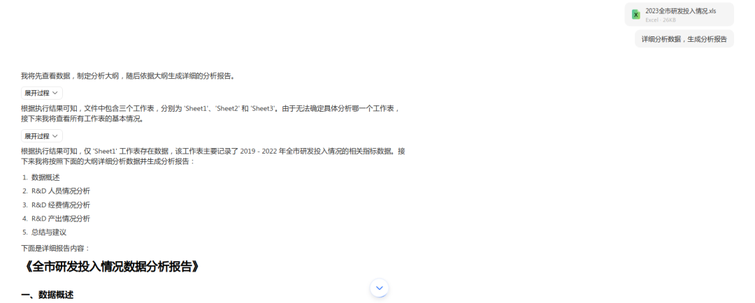 上传数据表格→提出要求(分析数据并形成数据报告)→AI对表格进行扫描并制定分析大纲→AI列举数据并进行分析→形成数据趋势图等可视化内容