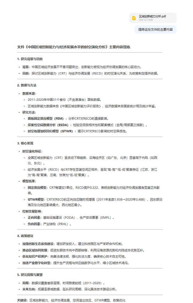 上传文件→输入要求(提炼主要内容)→AI进行分析并以条目式输出主要内容