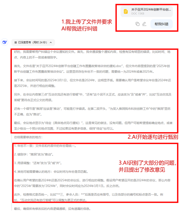 上传文件→输入要求(对文件进行纠错)→AI输出文件错误和修改建议
