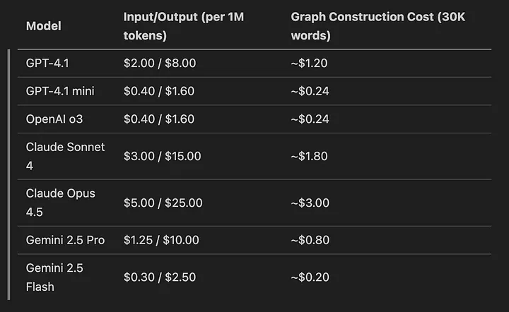 但这些收益是以相当大的成本换来的。使用 2025 年的模型定价构建知识图谱,可以计算其成本结构: