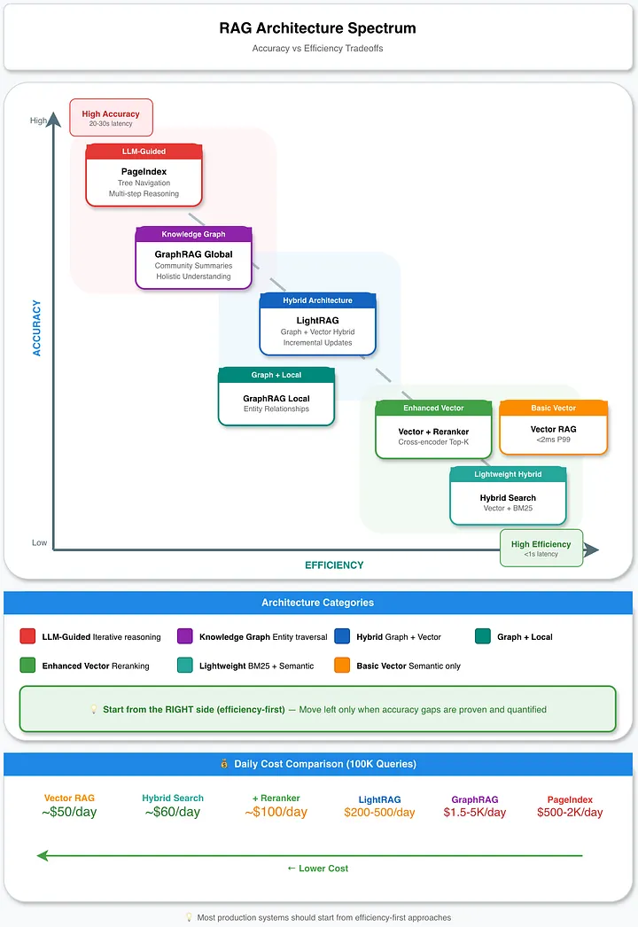 RAG 领域已经分化为几种不同的架构设计:基于向量的 RAG (如:VectorRAG)、基于知识图谱的 RAG(如:GraphRAG)以及基于 LLM 推理的 RAG(如:PageIndex)。每种设计的成本结构都截然不同。然而,像FinanceBench、MTEB和BEIR这样的基准测试几乎完全专注于检索质量。对于构建生产系统的开发人员来说,这种过度追求准确率的评估方法会造成一个危险的盲点,即对真正决定生产部署成败的效率、成本因素的忽视。