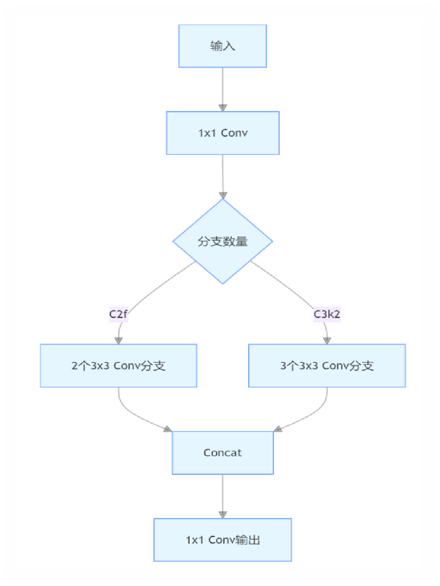 结构设计:将并行 3×3 卷积分支从 2 个增至 3 个,通过多分支特征拼接 + 1×1 卷积通道调整,动态提升网络深度 50%;