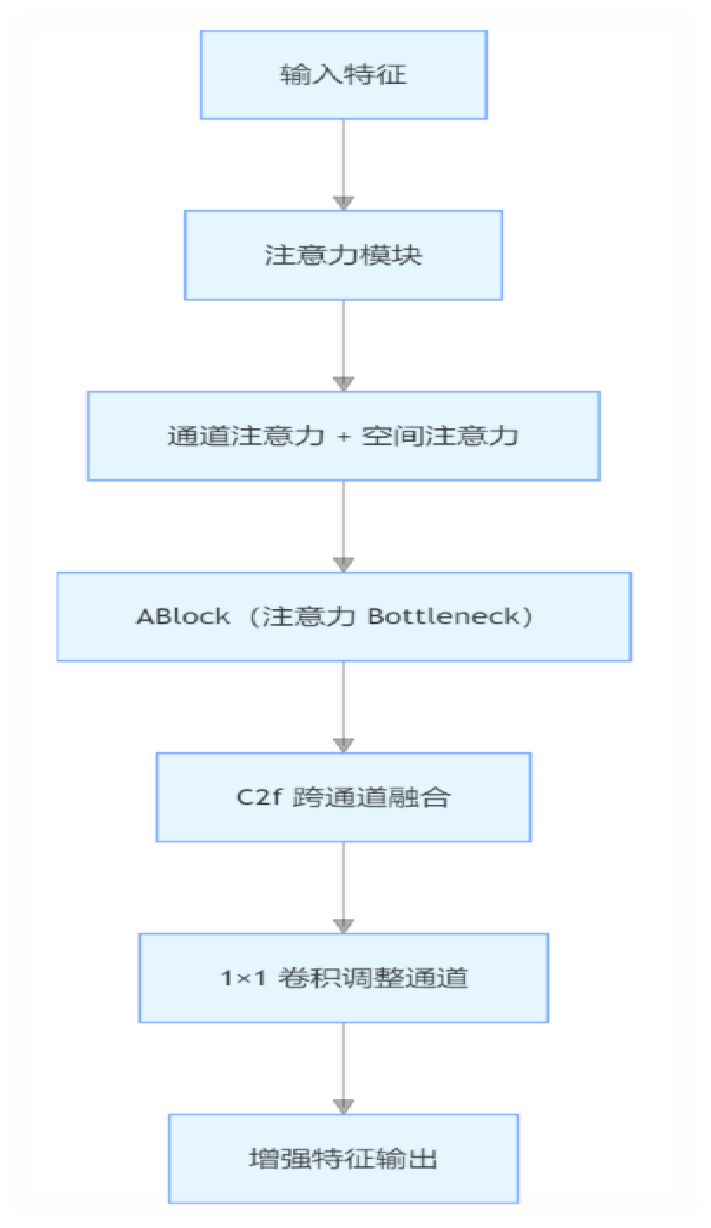 核心逻辑:通过 ABlock(注意力 Bottleneck)聚焦关键区域,替代传统 SPPF 实现多尺度特征聚合;