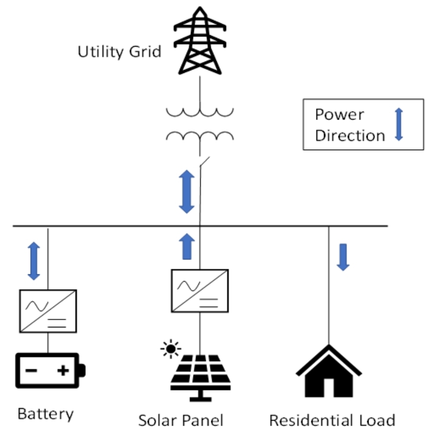 我们的系统主要包含电池、PV(光伏)、动态负载,它们通过PCC(公共连接点)连接到主电网。这就像一个复杂的能源网络,各个部分相互作用,而我们的目标就是通过控制电池的充放电,让整个系统的成本最优。