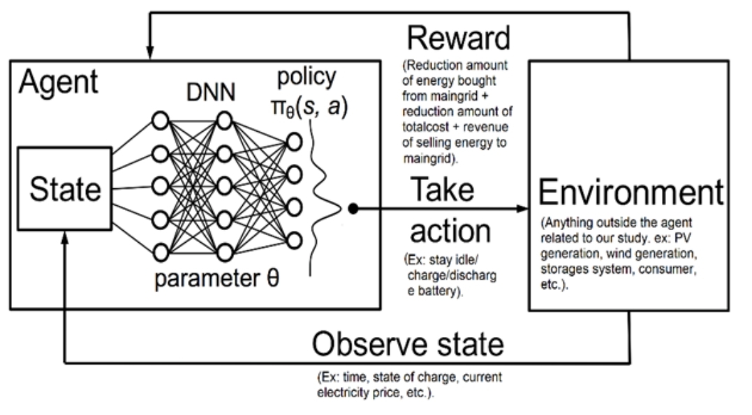 DRL用于训练代理(Agent),这里采用的是一种简单的无模型、基于策略的DRL方法。简单来说,策略被表示为行动的概率分布,这就好比是一个分类问题,类的数量等于我们可以执行的动作数量。比如说,我们的动作可能是充电、放电、不操作,那这就是3个“类”。
