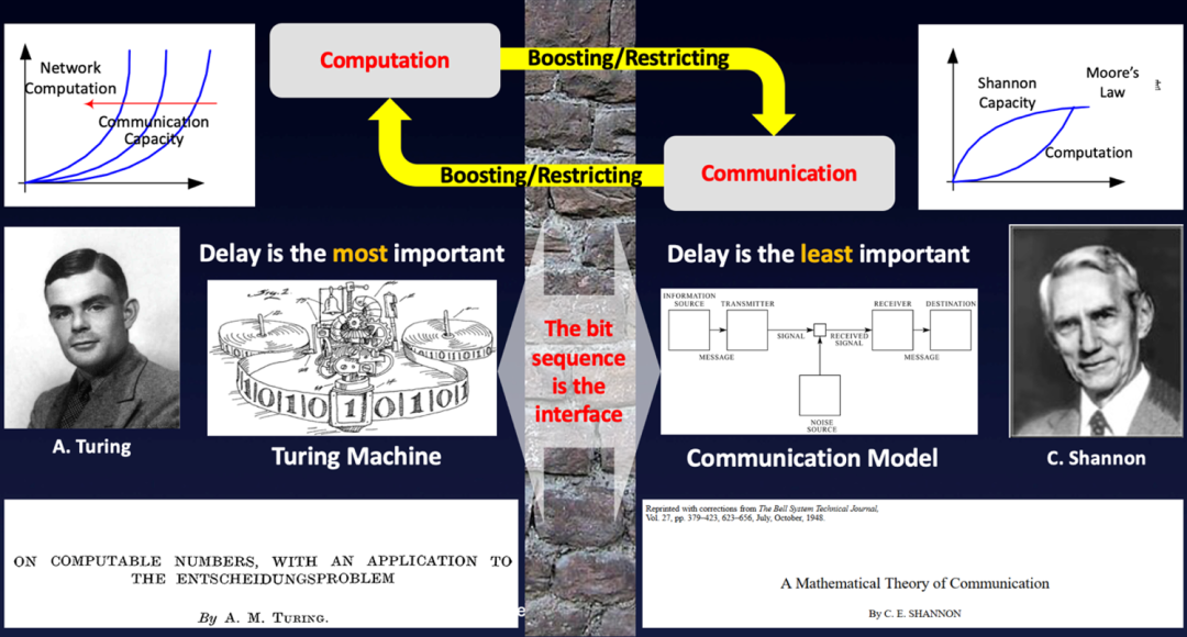 更广泛地看,我们经常用下图来表达计算理论和信息论之间的关系。图的左边是 Turing 和他的计算理论,他关心用多少个步骤能完成特定的计算,因此时延(通常用时间复杂度来度量)是最关键的指标。图的右边是 Shannon 和他的信息论,他关心的是通信速率的上限或者数据压缩的下限,即存在性和可达性。此时,通常假设码长趋于无穷大,因而时延是被忽略的。那么在实践中就会发现,开发通信算法的瓶颈永远是算力不够,算法复杂度太高;而研究计算算法的瓶颈永远都是(访存 / 卡间 / 服务器间)通信带宽不够,或者缓存 / 内存空间太小。