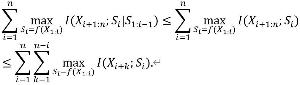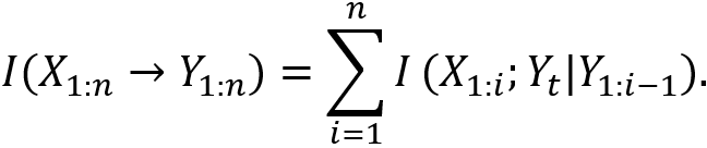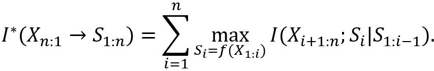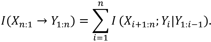从上述推导可以看出,CPC 实际上优化的是最优语义编码器的上界的 InfoNCE 逼近,所得到的语义编码器并不是最优的。如果我们有更好的工具来直接优化上述不等式最左端的条件互信息的和,那么将能得到性能更优的语义编码器。因此,这里要引入一个非常关键的信息论概念,即定向信息。这一概念的提出者是著名的信息论专家,1988 年香农奖得主,James Massey[21]。根据 Massey 的研究,从信道的输入序列