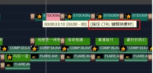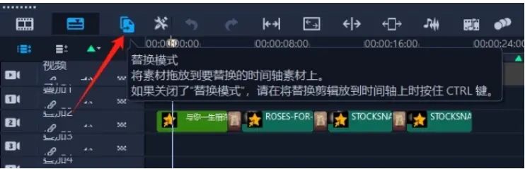 启用“替换模式”,启用之后的颜色如下图所示;然后直接从媒体库中拖拽新素材到要被替换的素材上松手即可实现替换!