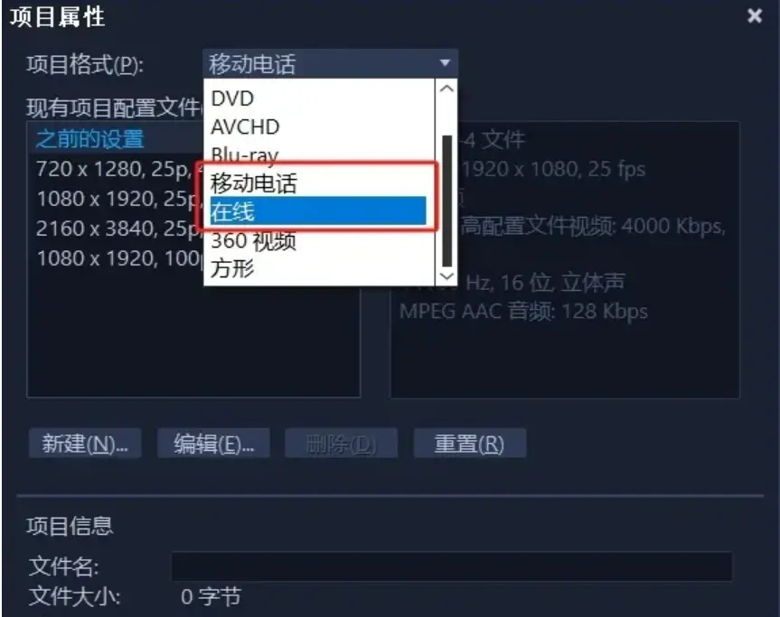 选择“现有项目配置文件”之后,还可以单击下方的“编辑”进行设置,根据自己的需要修改视频及音频的相关属性!