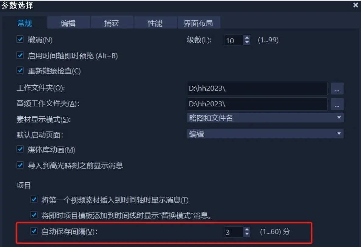 也可以在“参数选择”中修改“自动保存间隔”,如下图所示;