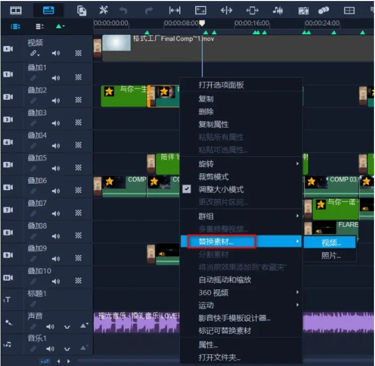 在要替换的素材上右击,在打开的快捷菜单中单击“替换素材”中的“视频”或“图片”,如下图所示;