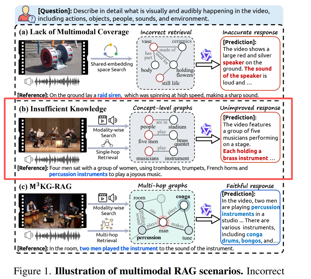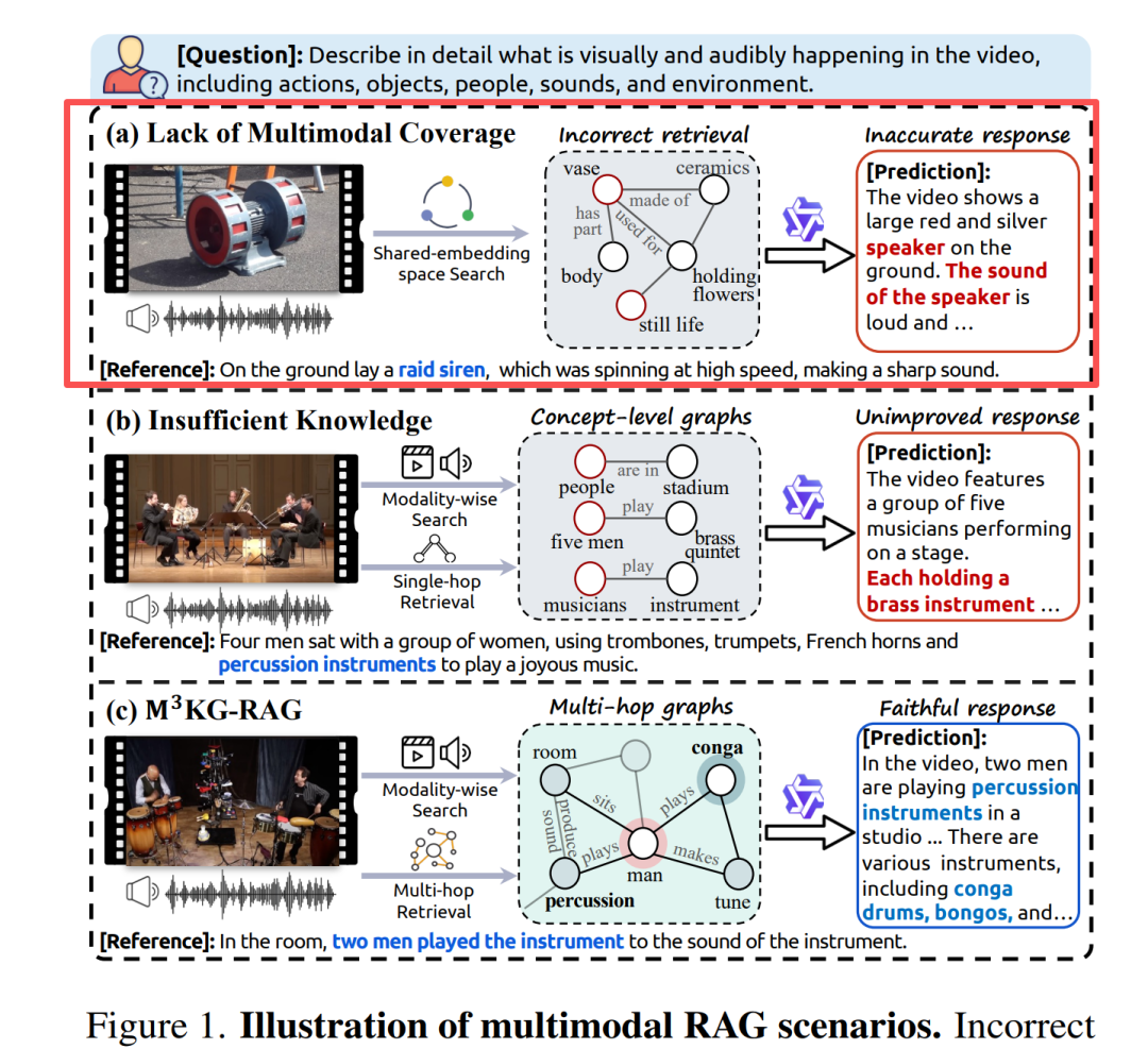 图 1(a):共享嵌入空间检索,音频-视觉查询与文本知识对不齐,直接答错。
