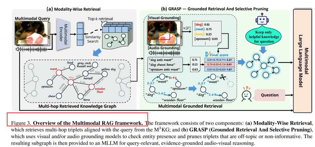 | ③ GRASP 精剪枝 | 用视觉/音频 Grounding + LLM 过滤,只留“ query 相关 + 答案有用”的子图 | 图 3(b) |