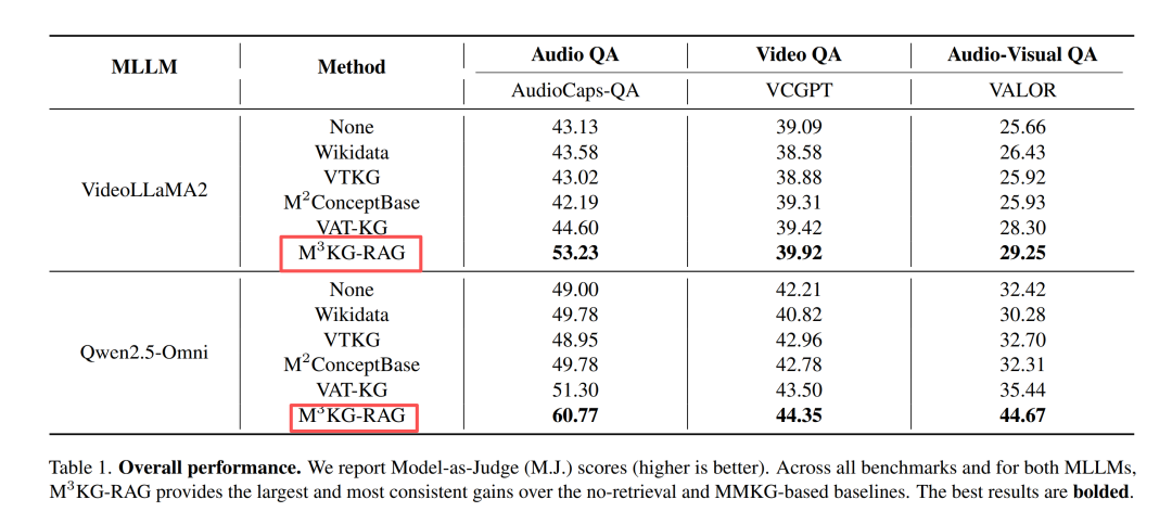 - 商业模型也奏效:GPT-4o 自带海量知识,M³KG-RAG 仍能再涨 2~3 分(见表 3)。